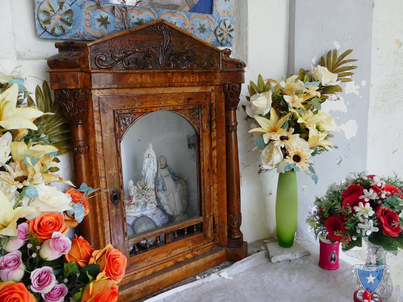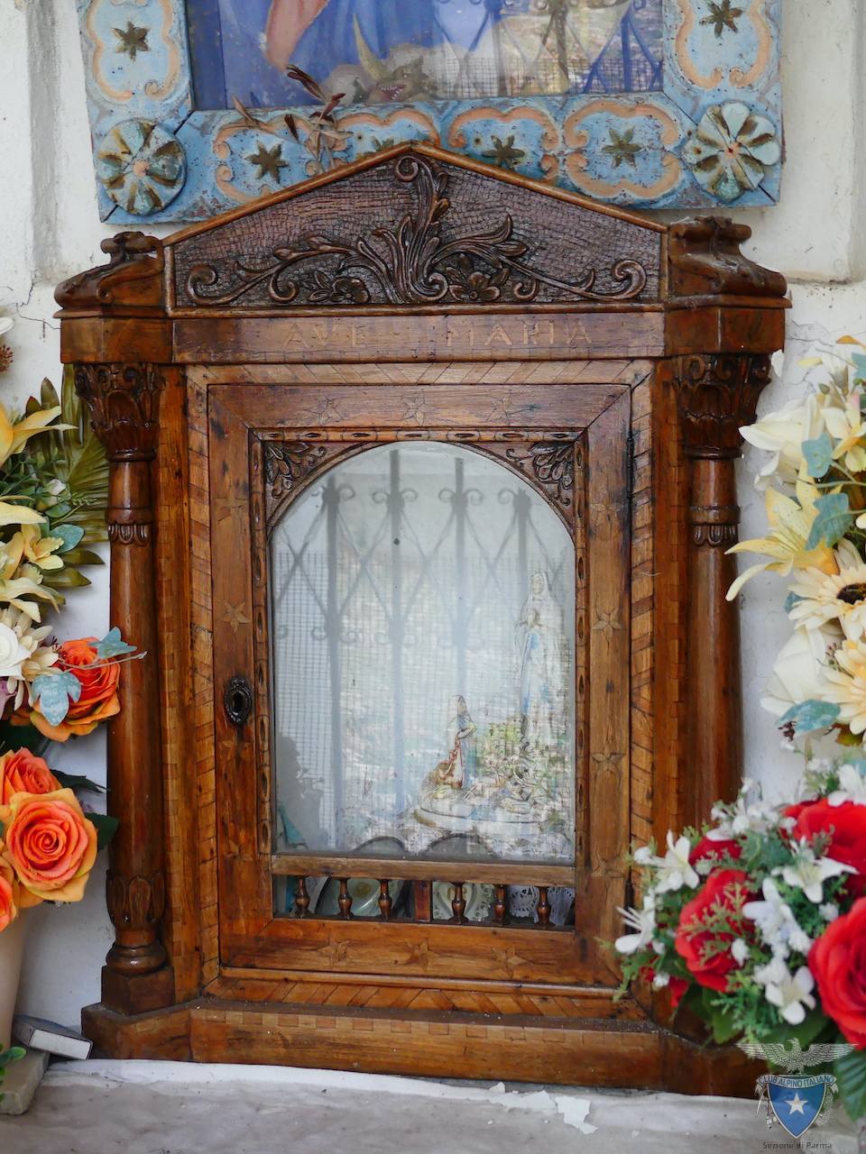 Al di sopra è raffigurata la Madonna Immacolata, orante a mani giunte sul petto e con l’aureola composta da 12 stelle.