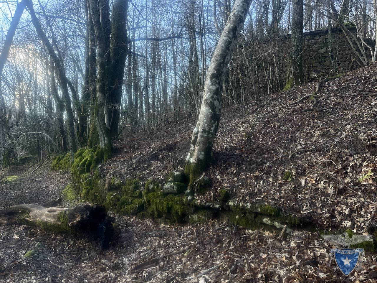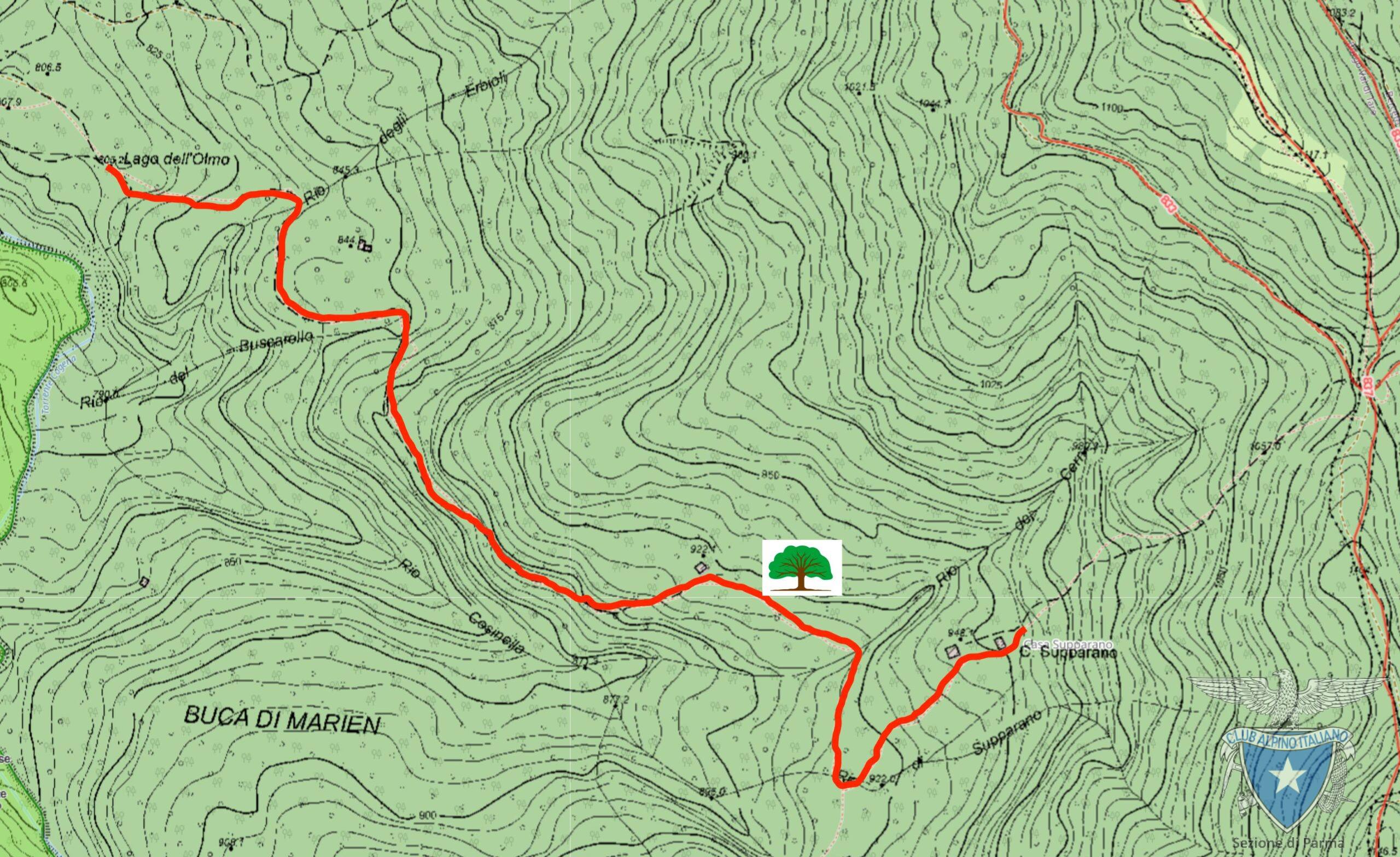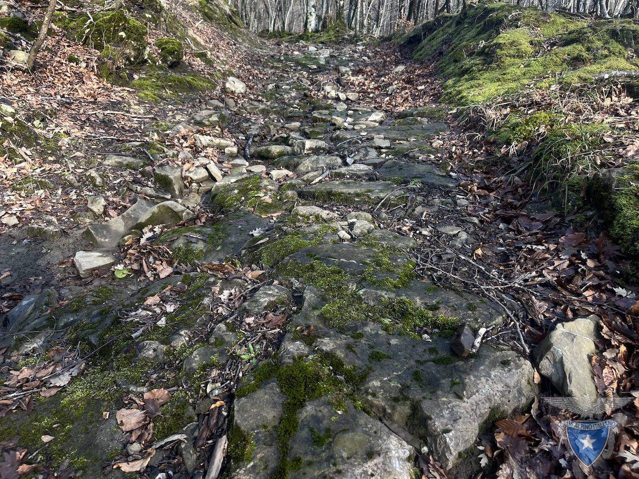 Il sentiero vero e proprio, caratterizzato dalla presenza di muretti a secco e tratti selciati, inizia da loc. Lago dell’Olmo e sale verso le abitazioni abbandonate di Case Supparano.